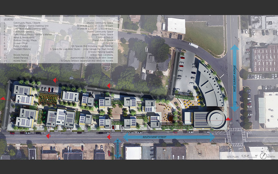The retail/ restaurant and office program components are located at the intersection of South Mint Street and West Summit Avenue. Building massing is pushed to the site boundaries to create a strong urban edge, and to allow for the placement of a large public plaza that hosts public functions such as weekend farmer’s market and outdoor art exhibits. The public plaza also serves as an outdoor dining area for the boutique restaurants and coffee shop.