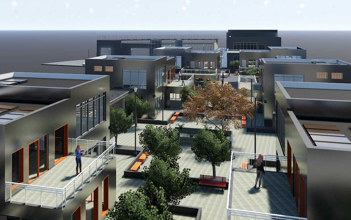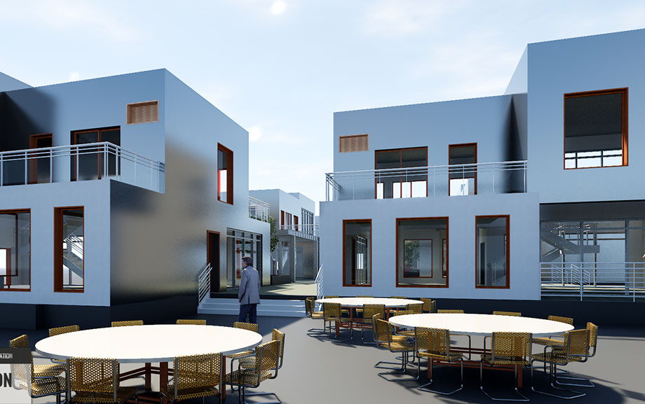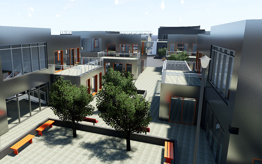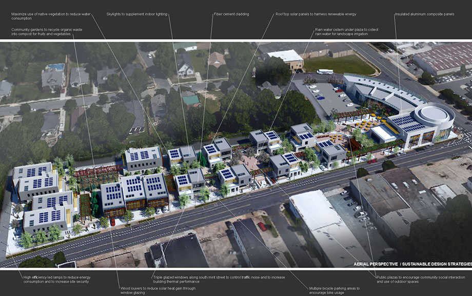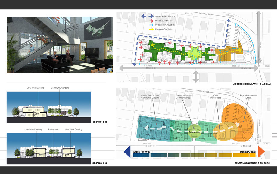The Promenade is a proposed mixed-use development that combines family townhouse dwellings and live/work studios with boutique retail/restaurant and office programs. This master plan parti organizes the diverse program components by creating an internal promenade that links the building massing with a series of outdoor plazas to create opportunities for social interaction, and to enhance the quality of indoor/outdoor living.