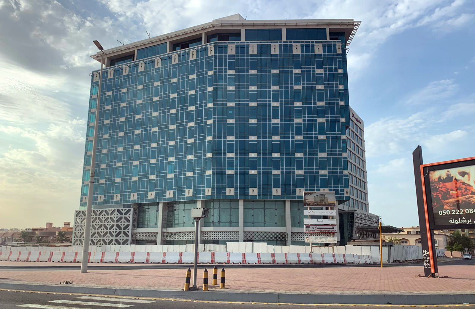The 300-room Al Salam Royal Terminal Hotel complex is located at the intersection of Prince Sultan Street and Al Salam Street in the northern part of Jeddah and close to the airport terminals. Designed to address the adjacent residential neighborhood and simultaneously its prominent corner location facing the main highway, the bent primary facade uses a combination of glazing types of various transparency to create a modern architectural expression. Punctuated with programmable LED lights spaced modularly on the featured facade, this 4-star business hotel is immediately recognizable from a distance.