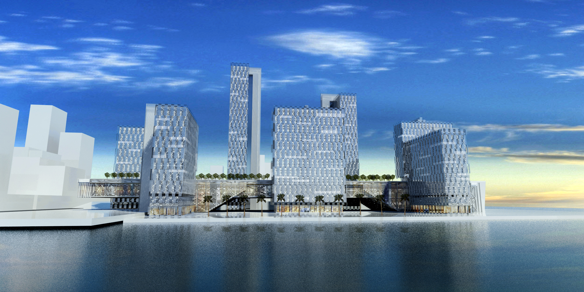 This proposed mixed-use project responds to the programmatic need of addressing the two main and distinct edges of the site. On the city side, there are four towers containing 3 office towers and a tall 4-star business-apartment hotel. On the quieter lagoons side, there are 2 residential towers flanking the central 5-star hotel.