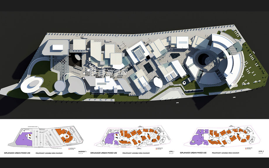 Designed for a prominent site directly across from the Mall of the Emirates in Dubai in the Al Barsha district, the Esplanade Urban Mixed-Use Development Master Plan contains over 600,000 SF of retail space. Conceptualized as an open air retail-entertainment development with a large anchor retail tenant and a series of boutique shops, the master plan is unified through a series of meandering covered promenades with glass operable walls. The design also features unique outdoor entertainment courts populated with interactive water features and greenery where visitors can congregate and dine in the huge selection of restaurants serving international cuisines.