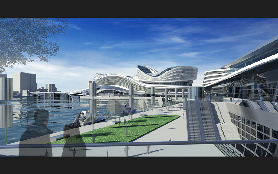 The Maritime Exhibition Center on the eastern site of the Kaohsiung Popular Music Complex Master Plan competition proposal will be a state-of-the-art 75,000 sf facility housing exhibits, conference halls, and ancillary retail. Adjacent to this venue, the arrangement of integrated greenbelts punctuated by large urban spaces and commercial zones broaden the waterfront boardwalk and provide accessibility into the site via bicycles, motorcycles, mass transit and water taxi transit.