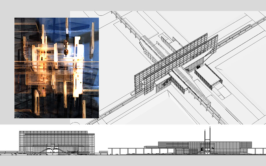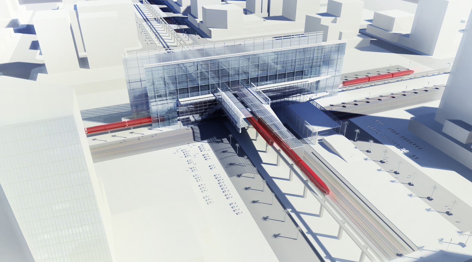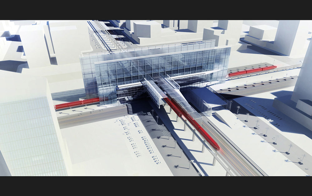The proposed concept design combines bus, light rail transit, and metro systems into a compact facility that is accessible from above ground level, at ground level and below street level. The minimal building volume allows better integration with the existing city grid.