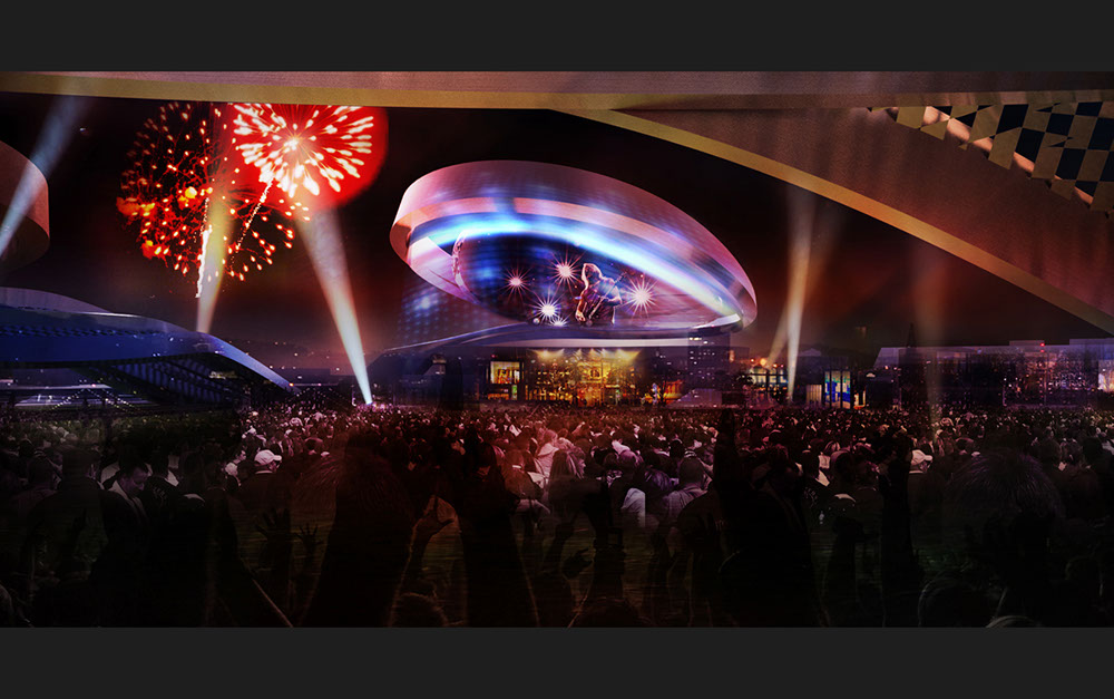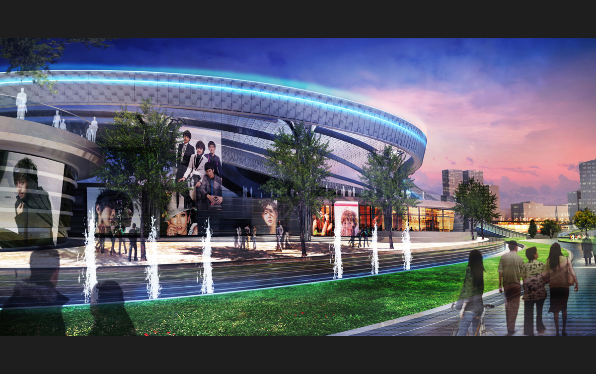 The Music Village district also contains a large green urban park that will host outdoor festivals as well as live music performances. Its centerpiece is a large elliptical high-definition screen that can broadcast worldwide shows.