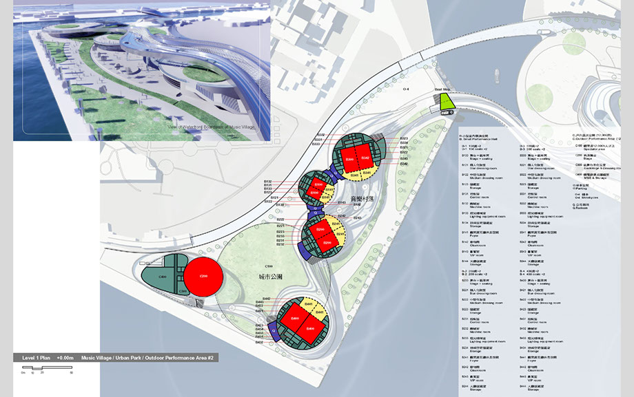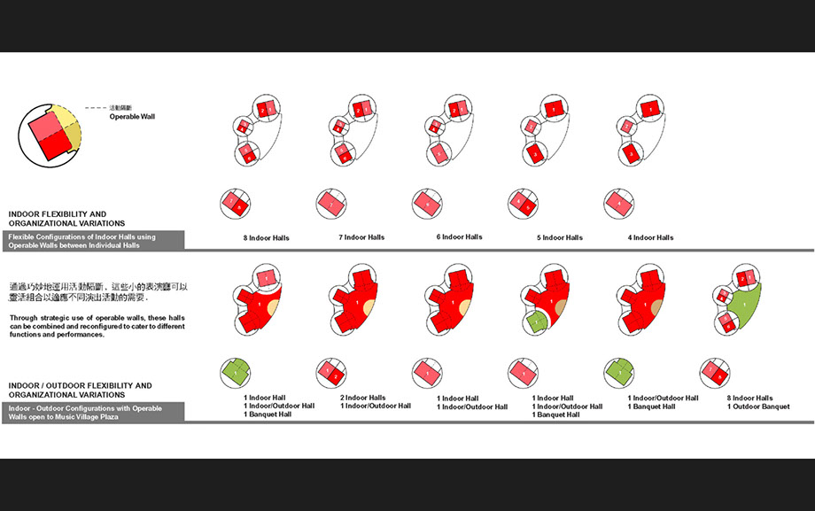 The Music Village component of the Kaohsiung Popular Music Complex competition proposal is intended as a collection of multi-use performance halls with flexible layouts that are able to accommodate large and small performances simultaneously through strategic use of operable walls.
