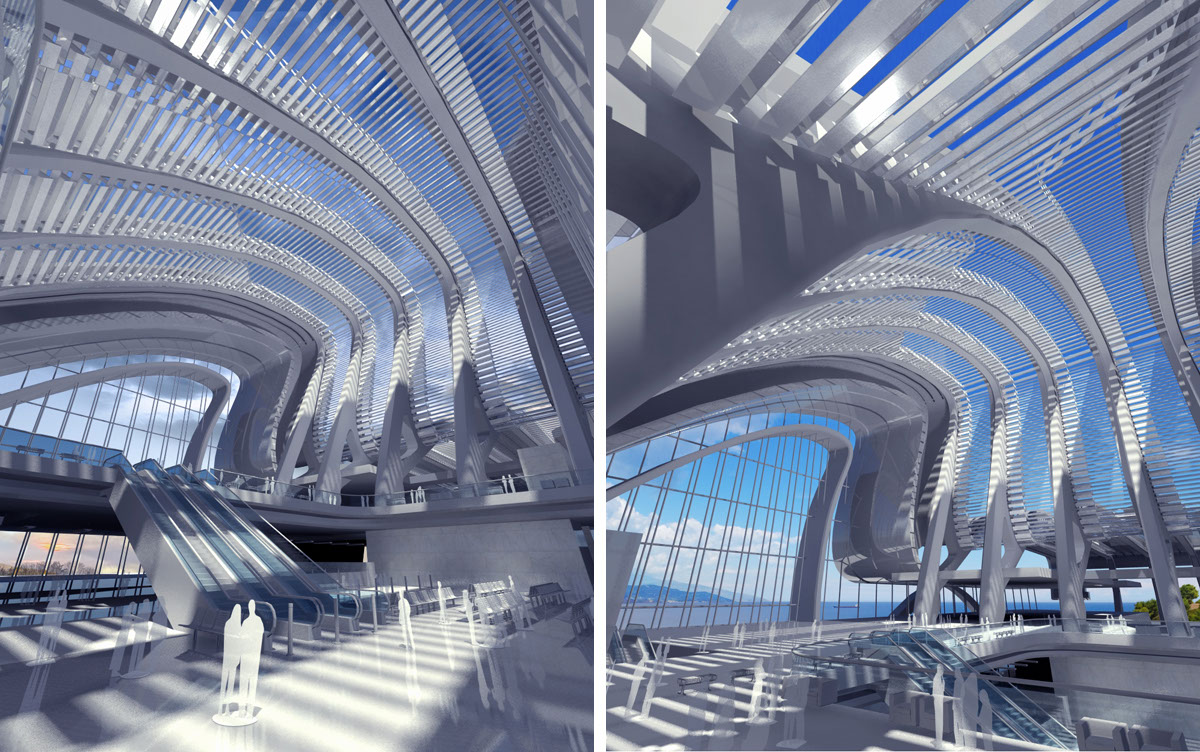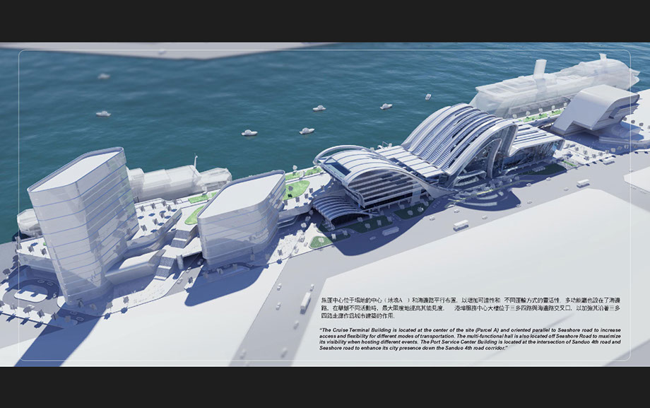 The design concept is inspired by the abstracted metaphor of the “rolling waves”. An iconic undulating roof form is used to unify all building components. The two prominent “waves” in the center of the complex house the two main program components: the Cruise Terminal Building and the Port Service Center.