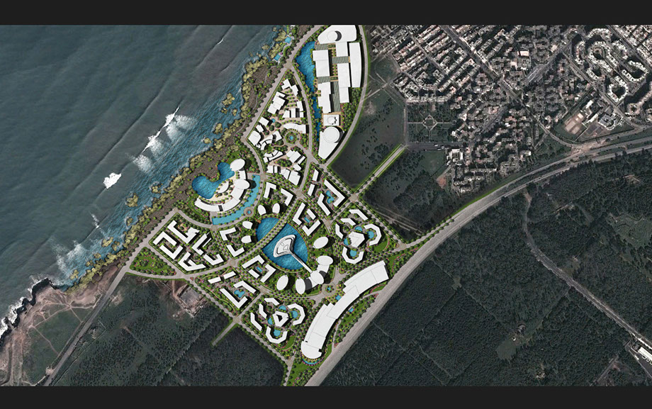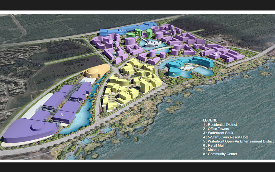 The proposed 168-acre mixed-use waterfront development is comprised of a residential district that slopes dramatically towards a rocky beach. A 5-star waterfront luxury resort adjacent to a traditional souk overlooking the ocean, a waterfront open-air entertainment district, and a large retail mall are some of many unique program elements that make this development a true tourist destination.